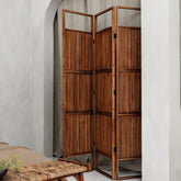 Der elegant-raffinierte, dreiteilige Raumteiler ist eine wunderschöne Ergänzung für klassische Räume. Gefertigt aus Teakholzrahmen und mit handgewebten, mit Kokosnussblatt bezogenen Paneelen versehen, ist er eine charmante Hommage an vergangene Zeiten. Alle Schränke werden fachmännisch aus recyceltem Teakholz gefertigt und in Handarbeit perfekt verarbeitet. Eine stilvolle und beruhigende Bereicherung für jeden Raum.