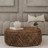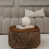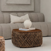 Dieses vielseitige Möbelstück kann als Couchtisch, Pouf oder zur Dekoration verwendet werden. Mit abgenommener Platte lässt es sich sogar als Korb verwenden. Der Knut Couchtisch ist aus umweltfreundlichen Materialien gefertigt, die Seitenteile bestehen aus handgewebten Abaca-Fasern und die abnehmbare Platte aus wiederverwertetem Teakholz. Ein multifunktionaler Blickfang in jedem Raum.
