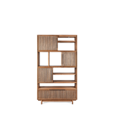 Der Grace Schiebetürenschrank, inspiriert von Mid-Century Modern und Mondrian, ist ein Schmuckstück vergangener Zeiten. Gefertigt aus recyceltem Teakholz, verströmt er mit seinen offenen und geschlossenen Schiebetüren einen vertrauten Retro-Charme. Die handgefertigten Schränke aus recyceltem Teakholz, deren Schiebetüren und Unterteil mit haptisch ansprechenden, gewebten Kokosnussblättern verkleidet sind, werden von eleganten, stromlinienförmigen Griffen aus Teakholz mit Perlmuster eingefasst. Zeitloses, wohnliches Design für die heutige Zeit.