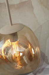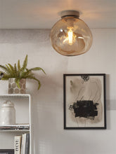 Die Deckenleuchte Helsinki besticht durch ihr einzigartiges Design und die außergewöhnliche, surreal geformte Glaskugel. Mit ihren kompakten Maßen von 26 x 26 x 28 cm fügt sich diese Leuchte perfekt in moderne Wohnzimmer, Esszimmer oder Flure ein. Das bernsteinfarbene Glas sorgt für ein warmes, einladendes Licht und setzt einen stilvollen Akzent in Ihrem Raum.